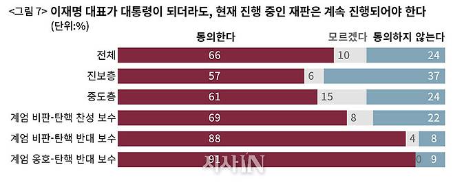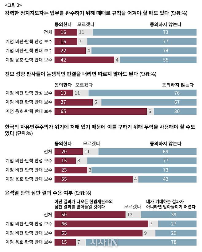보수 성향 응답자들에게 ‘진보 성향 판사들이 논쟁적인 판결을 내리면 따르지 않아도 된다’는 문장을 제시하고 동의 여부를 물었다(진보층에게는 ‘보수 성향’ 판사, 중도층에게는 ‘진보 혹은 보수 성향이 강한’ 판사의 판결을 따르지 않아도 되는지 물었다). ‘반계엄 찬탄핵 보수’는 13%만 동의하고 76%가 반대했다. ‘반계엄 반탄핵 보수’는 27%가 동의했지만 역시 대다수인 67%가 반대했다. 그런데 ‘찬계엄 반탄핵 보수’에서는 동의한다는 응답이 65%로 반대한다는 응답(30%)의 두 배 이상이었다. ‘매우 동의한다’라는 강한 응답만 따로 봐도 29%나 됐다.