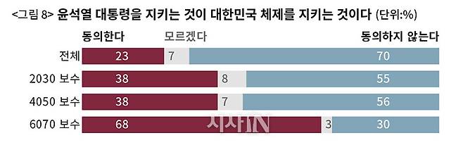 ‘전직 대통령 전두환이 대통령으로서 일을 잘 했다고 생각하느냐, 못했다고 생각하느냐’는 물음에, 반계엄 반탄핵 보수는 41%가 ‘잘했다’, 56%가 ‘못했다’고 했다, 찬계엄 반탄핵 보수는 73%가 ‘잘했다’고 답했다. ‘매우 잘했다’는 강한 응답만 따로 봐도 23%에 이른다. 같은 보수 내에서도 2030 보수는 69%가 전두환이 일을 ‘못했다’고 했다. 6070 보수는 64%가 ‘잘했다’고 한다. 윤석열이 아군으로 추켜세우는 2030 보수의 55%는, ‘윤석열 대통령을 지키는 것이 대한민국 체제를 지키는 것이다’라는 진술에 동의하지 않는다. 6070 보수는 68%가 동의한다. 2030 보수의 28%만이 부정선거 중국 개입설에 동의하고 47%는 동의하지 않는다. 25%는 ‘모르겠다’고 답했다. 6070 보수의 53%가 동의하는 것과 차이가 크다.