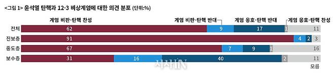 이 두 축으로 전체 여론을 나눠보면 계엄 정국의 지형도가 보다 선명하게 그려진다. ‘계엄이 잘못되었고 (아마도 그래서) 탄핵에 찬성’하는 사람들이 62%로 가장 많다. ‘계엄은 정당했고 (아마도 그래서) 탄핵에 반대’하는 사람들이 17%로 뒤를 잇는다. 그런데 그 가운데 어떤 사람들은, 계엄은 잘못이라면서도 윤석열 탄핵에는 반대한다. 우리 조사에서는 9%이다(계엄은 정당하지만 탄핵에 찬성한다는 이들은 1%로, 교차분석을 할 수 있는 크기가 아니어서 별도로 다루지 않는다).