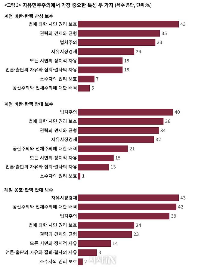 반면 ‘찬계엄 반탄핵 보수’가 자유민주주의에서 중시하는 특성은 다른 그룹과 확연히 달랐다. ‘자유시장경제(43%)’와 ‘공산주의와 전체주의에 대한 배격(42%)’ ‘법치주의(39%)’라는 응답이 가장 높았다. ‘법에 의한 시민 권리 보호(24%)’ ‘권력의 견제와 균형(23%)’에 대한 관심은 상대적으로 낮았다. 물론 ‘반계엄 반탄핵 보수’도 ‘자유시장경제’와 ‘공산주의와 전체주의에 대한 배격’을 중시한다는 응답률이 탄핵 찬성파에 비해 높은 편이지만, ‘찬계엄 반탄핵 보수’보다는 각각 11%포인트, 21%포인트 낮다. 즉 ‘반계엄 반탄핵 보수’는 자유시장경제를 신봉하는 반공주의자이긴 하지만, 그렇다고 해서 일련의 민주주의적 규범들을 희생하면서까지 ‘멸공’을 실천하려 하지는 않는 사람들이라는 해석이 가능하다.