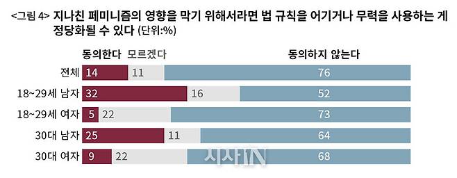 다만 2030 남성들의 버튼을 누르는 요인이 있다. 페미니즘이다. ‘지나친 페미니즘의 영향을 막기 위해서라면 법규칙을 어기거나 무력을 사용하는 게 정당화될 수 있다’는 문장을 제시했다. 전체에서 14%가 동의한 반면, 20대 남자의 32%, 30대 남자의 25%가 동의했다. 이는 동세대 여자들과 16%포인트에서 27%포인트 차이 날 뿐 아니라 여타 세대 남자들에 비해서도 튀는 수치다. 즉 2030 남성 대부분은 민주주의적 규범을 대체로 존중하지만, 적어도 이 집단의 네 명 중 한 명은 페미니즘에 대한 강한 반감과 불신을 이유로 무력도 불사할 준비가 되어 있다.