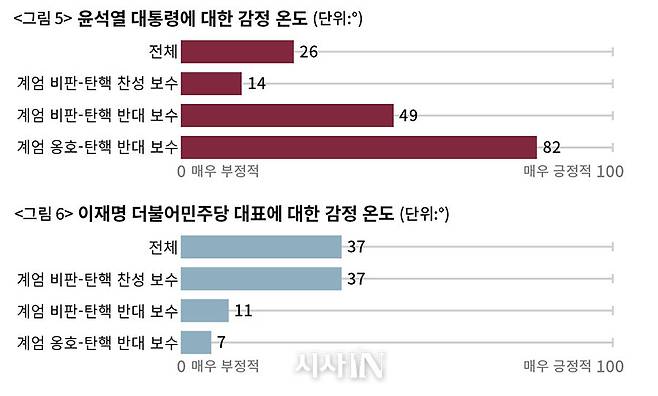 우리는 응답자들이 주요 정치인에 대해 느끼는 감정온도를 측정했다. 0도는 매우 차갑고 부정적인 감정, 100도는 매우 뜨겁고 긍정적인 감정이다. ‘찬계엄 반탄핵 보수’는 윤석열에 대한 감정온도가 82도나 된다. ‘반계엄 반탄핵 보수’는 49도로 뚝 떨어진다. 그런데 이 두 집단이 동시에 매우 차갑게 느끼는 정치인이 있다. 이재명 더불어민주당 대표다. 이들이 이 대표에 대해 느끼는 감정온도는 각각 7도와 11도로 별반 다르지 않다.