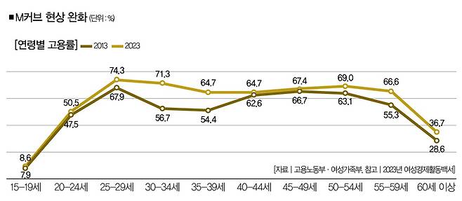 M커브는 일명 '경력단절여성'이라는 사회문제를 통계적으로 보여준다. 그런데 국내 노동시장에서 M커브 현상이 점점 자취를 감추고 있다. 지난 1월 고용노동부와 여성가족부가 발표한 '2023년 여성경제활동백서'에 따르면, 2023년 여성의 고용률은 10년 전(2013년)과 비교해 모든 연령층에서 상승했다.