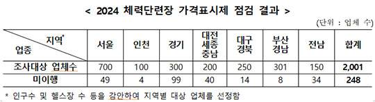 공정위가 24일 발표한 '2024년 헬스장 가격표시제 점검 결과'에 따르면, 수도권과 주요 시·도 소재 2001개 헬스장 중 248개 업체가 가격 표시제를 준수한 것으로 나타났다.