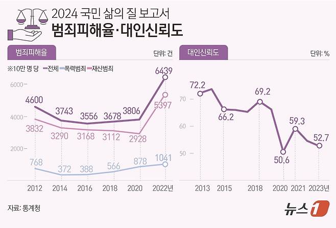 [그래픽] 2024 국민 삶의 질 보고서-범죄피해율·대인신뢰도
