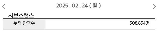 영진위 영화관입장권 통합전산망에 따르면, '서브스턴스'는 24일 오전 10시 기준 50만 관객을 돌파했다. 누적관객수 50만 8,854명이다.