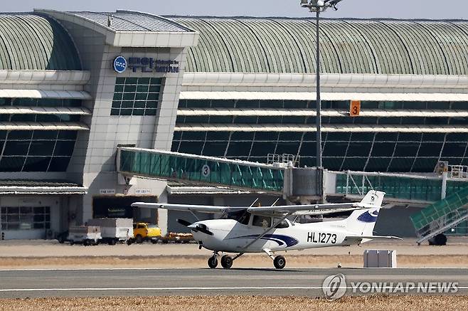 (무안=연합뉴스) 조남수 기자 = 12·29 제주항공 여객기 참사 56일 만인 24일 오후 전남 무안국제공항에 착륙한 교육용 훈련기가 이동하고 있다. 항공 당국은 교육 기관이 주간에 방위각 시설(로컬라이저)을 사용하지 않는 시계 비행을 허가했다. 2025.2.24