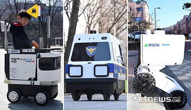 왼쪽부터 서울 양천구 파리공원에서 재활용품을 수거하는 로보티즈 '개미', 경기 부천시 계남초 인근을 순찰중인 도구공간의 '패트로버', 경기 고양시 힐스테이트 라피아노 단지에서 배송 서비스를 실증하며 계단에 오르는 모빈의 라스트마일 서비스 로봇 'N3'.