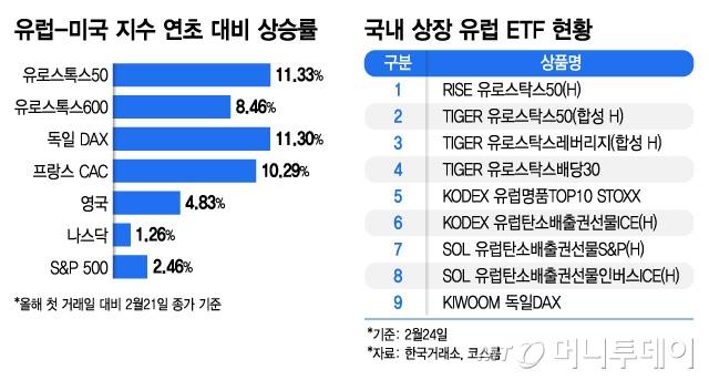 한국거래소와 코스콤 ETF체크에 따르면 국내에 상장된 ETF는 9개다. 현재 국내 증시에 상장된 유럽 관련 ETF로는 유로스톡스 50을 추종하는 상품 2개와 유로스톡스 셀렉트 배당 30 등 대표지수 추종 상품이 3개가 있다. 유럽 탄소배출권 ETF 3종이 있지만 이는선물에 투자하는 상품으로 직접적인 주식시장과의 연관성은 낮다. 특정 국가에 투자하는 ETF로는 KIWOOM 독일DAX가 유일하다. 대표지수 추종 상품은 아니지만 특정 명품·럭셔리 산업을 겨냥한 KODEX 유럽명품TOP10 STOXX도 상장돼 있다.