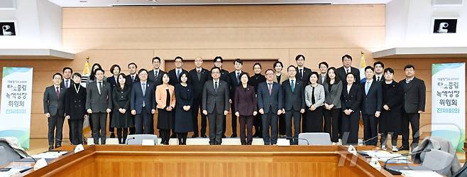 (서울=뉴스1) = 최상목 대통령 권한대행 부총리 겸 기획재정부 장관이 24일 오후 서울 종로구 정부서울청사에서 열린 2050 탄소중립녹색성장위원회 전체회의에서 참석자들과 기념촬영을 하고 있다. (기획재정부 제공, 재판매 및 DB금지) 2025.2.24/뉴스1