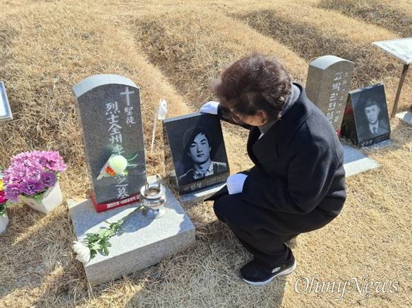 | ▲ 김동연 경기지사의 부인 정우영씨가 24일 광주광역시 북구 망월동 5·18구묘역(민족민주열사묘역)을 찾아 이한열 열사 묘지를 참배하고 있다. |