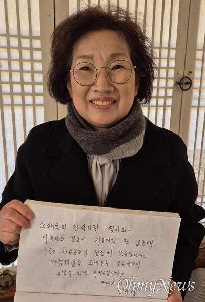 | ▲ 김동연 경기지사의 부인 정우영씨가 24일 전남 담양군 소쇄원을 찾아 방명록을 작성한 뒤 들어보이고 있다. |