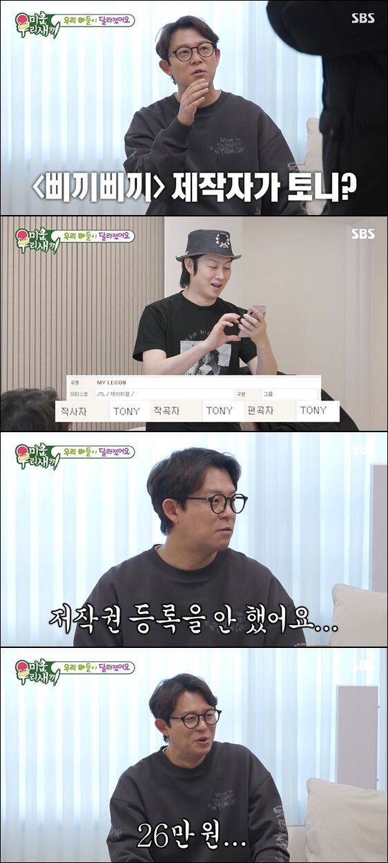 지난해 뒤늦게 저작권 협회를 찾아가 해당 곡의 저작권 등록을 마쳤다는 토니안. 그 후 들어온 저작권료에 대해 묻자 그는 "대형차 핸들 정도"라며 "3개월 동안 들어온 게 26만원 정도다"라고 말했다. 챌린지의 유행이 지난 후에 등록한 저작권이라 큰 돈벌이는 안 됐던 것. 토니안은 아쉬운 마음을 감추지 못했다.