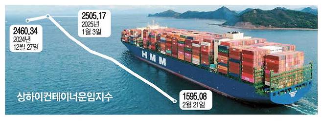 24일 해운업계에 따르면 세계 해상운송 운임 수준을 나타내는 상하이컨테이너운임지수(SCFI)는 지난 21일 기준 1595.08로 집계됐다. 일주일 새 163.74포인트 떨어진 것이다. 지난 1월 첫째주(2505.17) 이후 6주 연속 하락한 것으로 SCFI가 1700선을 밑돈 건 14개월여 만에 처음이다. 업계에서는 SCFI 1000을 손익분기점으로 본다. 미국의 관세 도입이 불확실성을 높이고 있다. 트럼프 대통령은 다음달 12일부터 미국이 수입하는 모든 철강과 알루미늄 제품에 25% 관세를 부과하기로 결정했다. 자동차·반도체·의약품에 약 25% 관세를 부여하겠다고도 예고했다. 여기에 더해 춘제 이후 계절적 수요 둔화와 선복 증가 등이 해상운임 하락으로 이어졌다는 분석이다. 지난해 해상운임이 강세를 나타낸 원인이었던 홍해 사태가 해결될 것이라는 전망도 나온다. 2023년 말 예멘 후티 반군이 홍해를 지나는 선박을 공격하기 시작한 이후 글로벌 해운사들이 지름길인 수에즈 운하를 포기하고 희망봉으로 우회해 운행하면서 지난해 연평균 SCFI는 전년 대비 149% 상승했다.
