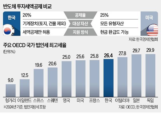 반면 미국은 반도체 세액공제 때 사무동을 제외한 생산 및 R&D 관련 건물·토지 투자금의 25%만큼 공제해 준다. 세액공제 범위가 넓고 공제율도 5%포인트 높다. 공장 건물에 3조원, 장비에 7조원을 투자하면 미국에선 2조5000억원(10조원의 25%)을 돌려받지만, 한국에선 1조4000억원(7조원의 20%)뿐이다.