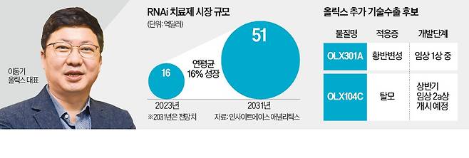 이동기 올릭스 대표는 24일 한국경제신문과의 인터뷰에서 "지난해 투자자들에게 한 두 건의 기술수출 약속을 연내 모두 지킬 수 있을 것"이라며 이같이 말했다.