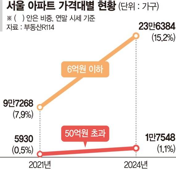 6억원 이하 아파트는 2021년 말 9만7268가구에 불과했으나 2024년 말에는 23만6384가구로 2.4배로 늘었다. 비중도 이 기간 7.9%에서 15.2%로 증가했다. 6억 초과~9억원 이하는 25.2%에서 25.5%로 소폭 늘었다. 즉 중저가 중에서도 저가 아파트가 더 가파르게 늘어난 것이다. 중저가 아파트는 지난 집값 급등기 때인 2021년에는 패닉바잉 수요가 몰리면서 비중이 크게 줄었으나 이후 계속 늘고 있다.