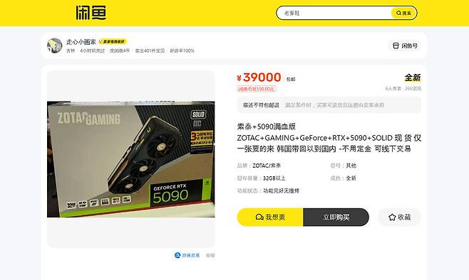 | 中 중고 사이트 올라온 국내 유통 GPU 중국 중고거래 사이트 ‘셴위’에서 3만9000위안(약 770만원)에 판매 중인 한국 유통 엔비디아 지포스 RTX 5090 그래픽카드 판매글. 셴위 캡처 |