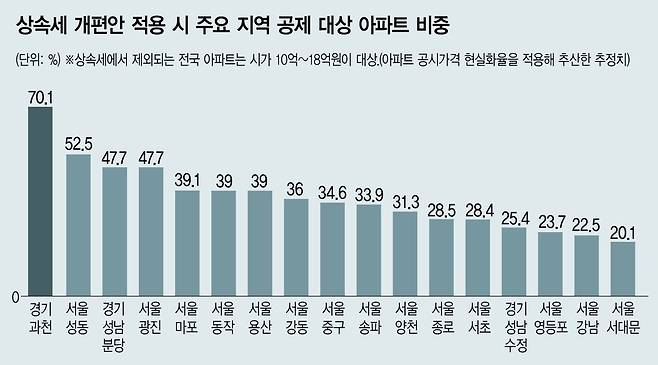 분석 결과, 민주당 개편안으로 상속세 부담을 덜 수 있는 아파트는 서울·수도권에 몰려 있었다. 전체 아파트 가운데 10억~18억원 아파트 비중이 가장 높은 곳은 경기 과천시다. 해당 지역 아파트 10곳 중 7곳이 면세 대상이 된다. 서울 성동구(52.5%), 성남 분당구(47.7%)와 서울 광진구(47.7%), 마포구(39.1%), 동작·용산구(39.0%), 강동구(36.0%), 중구(34.6%), 송파구(33.9%) 등의 순으로 면세 대상 아파트 비중이 높았다. 전체 아파트 가운데 면세 대상 아파트 비중이 20%를 웃돈 지역은 전국 250개 시군구 가운데 서울 자치구와 과천·성남시 등 17곳에 불과했다. 민주당 개편안의 수혜가 서울과 경기도 일부 자치구에 한정된다는 뜻이다.