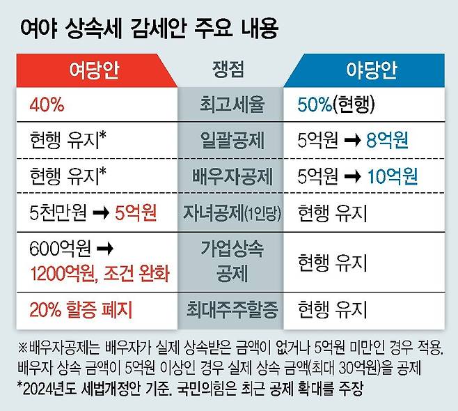 하지만 상속세 대상자들이 자산 계층인데다, 민주당이 겨냥한 수혜자들이 특정 지역에 쏠려 있는 현실은 앞으로 논란을 부를 수 있다. 오건호 내가만드는복지국가 정책위원장은 “종합부동산세를 내지 않는 상한선(공시가 12억원)과 맞춘 상속세 공제 확대는 부자 감세인데 중산층 감세로 민주당이 호도하고 있다”고 지적했다. 정치권에서도 반발이 나온다. 차규근 조국혁신당 의원(정책위의장)은 이날 당 최고위원회에서 “개별 세목 중엔 완화해야 하는 부분도 있을 수 있다”면서도 “세금은 거대 양당만의 문제가 아니다. 국회에 조세개혁특위를 설치하자. 선거용 졸속 감세 정책이 아니라 백년지대계를 논의하자”고 주장했다.