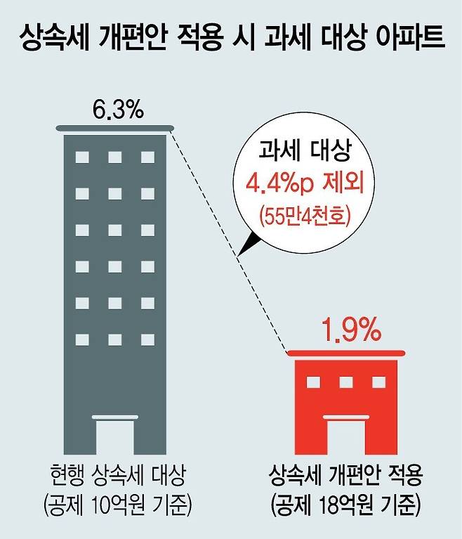 면세 범주에 포함되는 아파트의 가구수 기준으로는 성남시 분당구가 약 6만가구로 가장 많았다. 이어 서울 송파구(4만5천가구), 강동구(3만5천가구) 등의 순이었다. 강남·서초구는 면세 범주 대상에 속한 아파트가 적었다. 대부분 18억원 이상 초고가 아파트가 해당 지역에 포진하고 있기 때문이다. 민주당 안대로 입법되면 전국 아파트 가운데 상속세 납부 대상 아파트 비중은 6.3%에서 1.9%로 확 줄어든다. 면세 대상에 추가되는 아파트는 약 55만채에 이른다.
