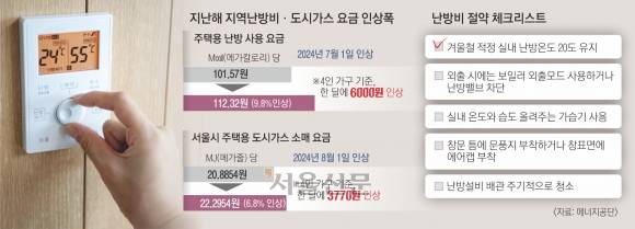 도시가스를 주 연료로 하는 개별 난방비도 올랐다. 서울시 주택용 도시가스 소매 요금은 지난해 8월 1일 MJ(메가줄) 당 20.8854원에서 22.2954원으로 6.8% 인상됐다. 이에 따라 4인 가구 기준으로 한 달 평균 3770원을 더 내게 됐다.
