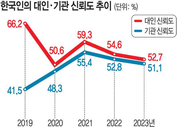 타인과 국가 주요 기관을 향한 불신이 2년 연속 깊어진 것으로 나타났다.