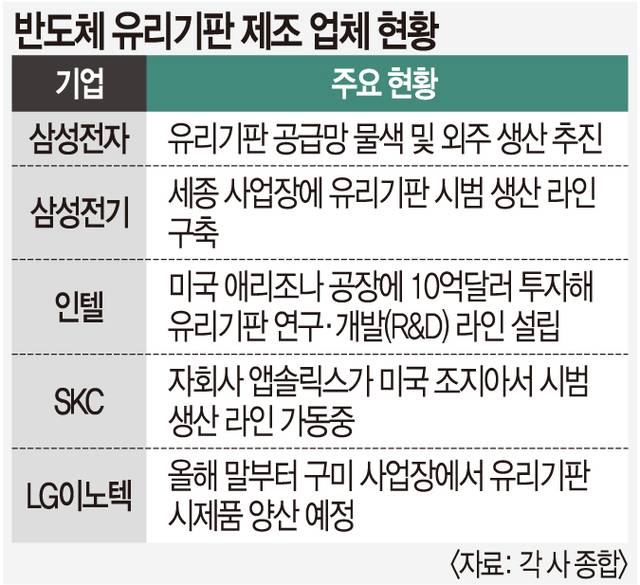 SKC는 자회사 앱솔릭스를 통해 유리기판을 직접 생산할 계획이다. 앱솔릭스는 이미 미국 조지아주에 공장을 준공한 상태로 이르면 올해 말부터 양산에 돌입할 것으로 보인다. LG이노텍도 지난해 3월 미래 성장동력 확보 차원에서 유리기판 사업 착수를 공식화했고, 조만간 구미 사업장에서 시험 생산에 돌입할 예정이다.
