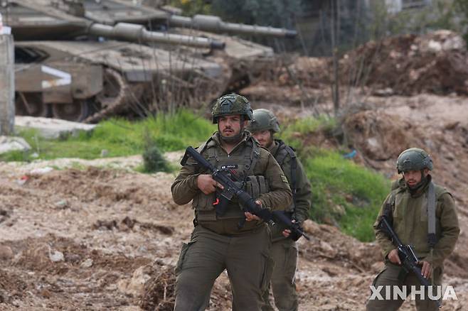 [제닌=신화/뉴시스] 24일(현지 시간) 이스라엘 군인들이 요르단강 서안지구 제닌에서 군사 작전을 수행하고 있다. 이스라엘의 이스라엘 카츠 국방부 장관은 자국 군에 서안지구 난민촌에서의 장기 주둔을 대비하라고 지시했다. 2025.02.25.