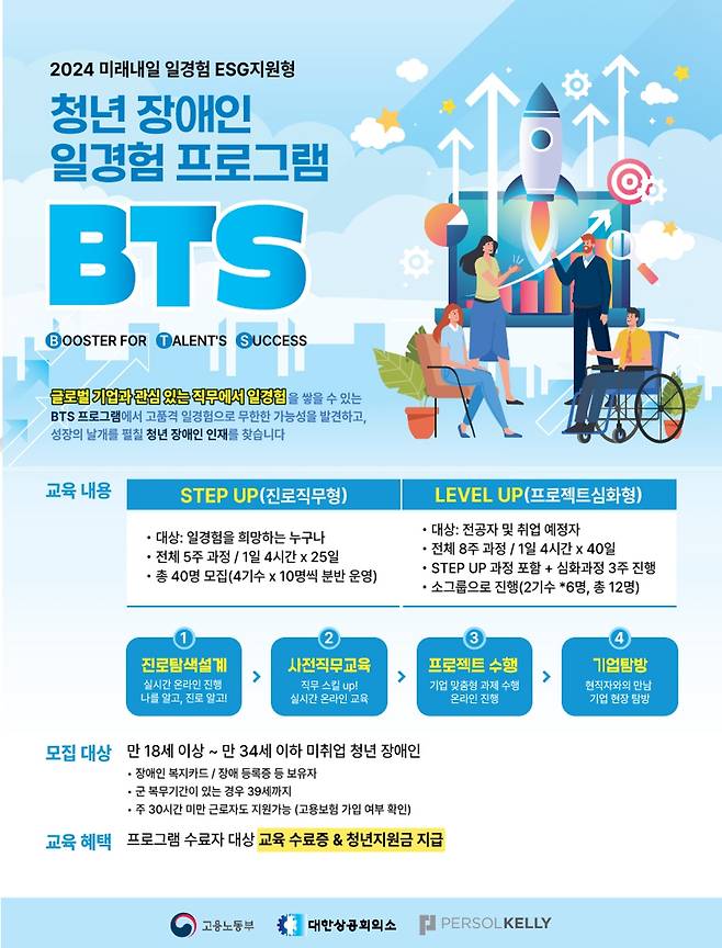 체계적인 커리어 설계부터 실무 역량 강화까지 지원하는 청년 장애인 일경험 프로그램 BTS(Booster for Talent’s Success)가 2024년에 2년 차를 맞이하여, 고용노동부의 ‘미래내일 일경험 사업’으로 운영되었다. 본 프로그램은 진로설계 맞춤형, 지역 거점형, 장애 유형별 맞춤 지원형 등 더욱 세분화된 운영을 통해 2023년 대비 한층 진화된 지원 체계를 선보였다.