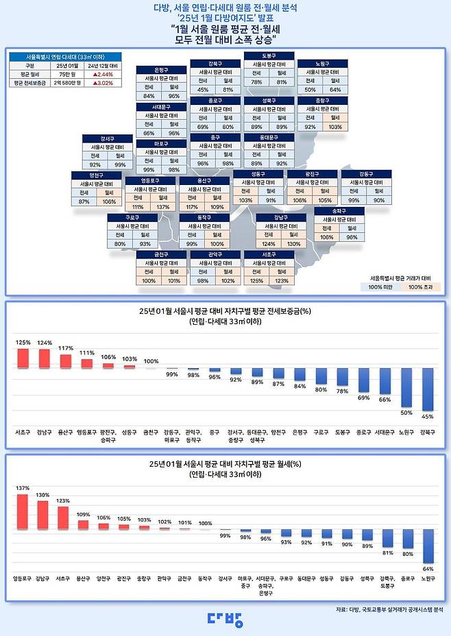 25일 부동산 정보 플랫폼 다방이 지난달 기준 서울 빌라 원룸의 월세와 전셋값을 조사한 결과, 서울 전체 평균 월세는 75만 원, 평균 전세 보증금은 2억580만 원으로 조사됐다. 지난해 12월 대비 월세는 2만 원(2.4%), 전세 보증금은 603만 원(3%) 올랐다. 조사 대상은 전용면적 33㎡ 이하 원룸이었다. 월세는 보증금 1000만 원 기준으로 환산한 금액을 기준으로 삼았다.