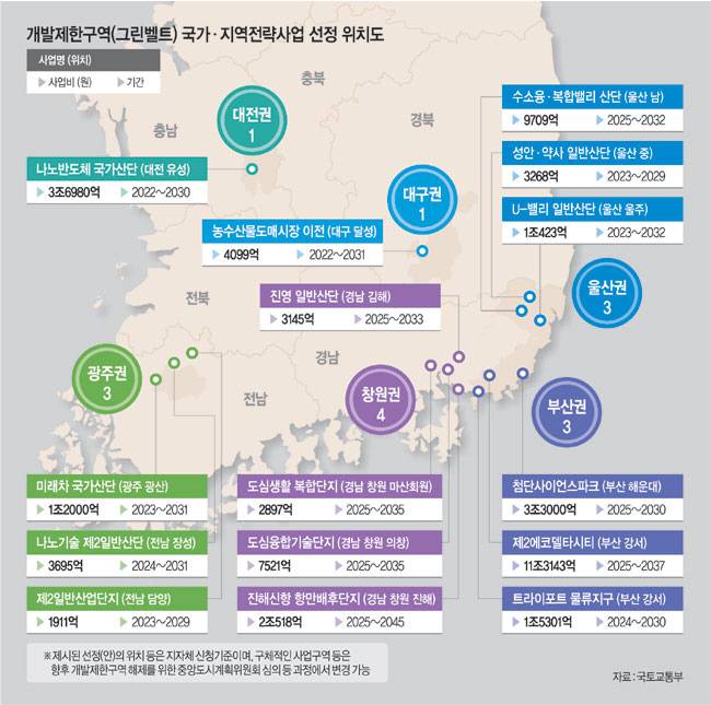 구체적인 선정 대상은 창원권이 △진해신항 항만배후단지 △도심융합기술단지 △도심생활 복합단지 △진영 일반산단 등 4건으로 가장 많다. 부산권에는 가장 넓은 그린벨트(10.42㎢)를 품은 제2에코델타시티를 포함해 동북아물류플랫폼, 첨단사이언스파크 등 3건이다. 광주권에서는 △미래차 국가산단 △나노 제2일반산단 △담양 제2일반산단, 울산권에서는 △수소융·복합밸리 산단 △U-밸리 일반산단 △성안·약사 일반산단 등 3건씩이다. 이 밖에 대구권 농수산물도매시장 이전, 대전권 나노반도체 국가산단 등 각 1건이다.