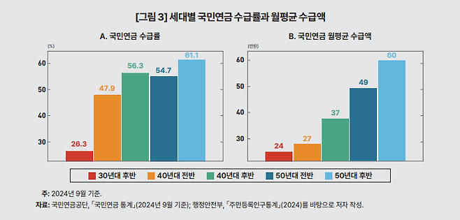 이런 차이는 세대 간 국민연금을 받는 혜택의 크기가 다르기 때문이다. 국민연금은 1998년에 이르러서야 전 국민을 대상으로 시행된 만큼, 수급률과 수급액에 있어 최근 출생 세대일수록 증가할 수밖에 없다. 특히 1950년대 이후 출생 세대의 국민연금 수급률을 60%에 가까운 만큼 앞으로 고령층에 진입하게 될 60년, 70년대생에게 국민연금을 실질적인 노후 보장책이 될 것이다.