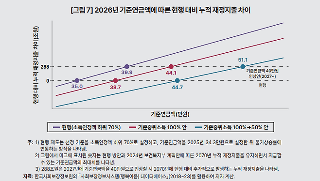 이와 함께 연금 수급 대상을 사회 전체 기준에서 상대적으로 빈곤한 노인들로 점차 좁혀 나갈 필요가 있다고 봤다. 소득인정액에 따라서 급여액을 차등 지급하는 방식까지 도입하면 보다 효율적으로 노인 빈곤 문제를 해소해나갈 수 있다는 것이다.