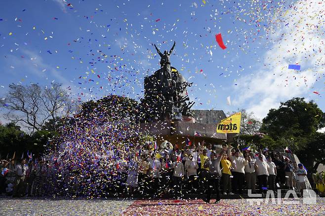 [케손시티=AP/뉴시스] 25일(현지 시간) 필리핀 케손시티 '피플 파워' 기념비 앞에서 당시 대통령 페르디난드 마르코스를 축출한 '피플 파워' 혁명 제39주년 행사가 열려 참석자들 위로 색종이가 날리고 있다. 필리핀 국민은 1986년 2월 25일 무혈 혁명을 통해 마르코스 대통령의 20년 독재를 종식하고 민주주의를 회복했다. 2025.02.25.