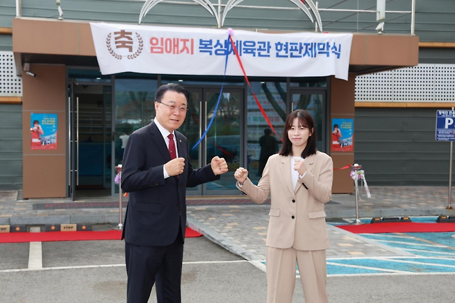 <사진> 대한체육회 경기 부문 장려상을 받은 임애지와 화순군청 구복규 군수. 화순군청 제공