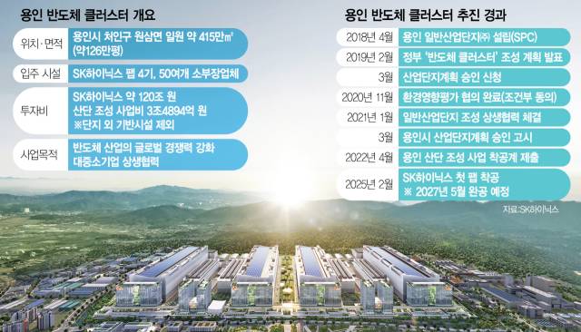 용인시 원삼면 일대 415만 ㎡(약 126만 평) 규모의 부지에 구축될 용인 반도체 클러스터에는 SK하이닉스 팹(약 60만 평)과 소부장(소재·부품·장비) 업체 협력화단지(14만 평), 기반 시설(12만 평) 등이 들어선다.