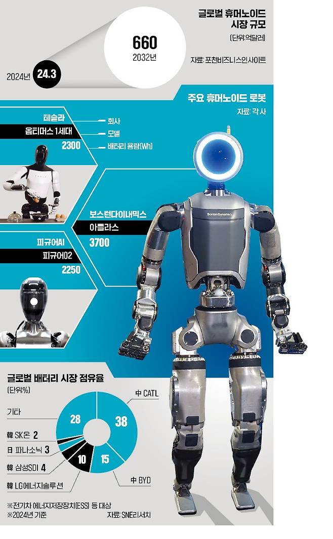 업계 관계자는 “1시간 일하고 충전 스테이션으로 가야 하는 휴머노이드를 누가 사겠냐”며 “고성능 배터리를 먼저 확보한 업체가 휴머노이드 전쟁의 승자가 될 것”이라고 말했다.
