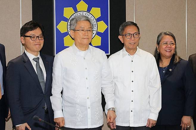 (서울=연합뉴스) 한국전력은 25일 필리핀 마닐라에서 김동철 사장이 필리핀 에너지부 장관과 면담을 갖고 2040년까지 재생에너지 비중을 50%로 확대하려는 필리핀의 에너지 정책 목표 달성을 위해 협력하기로 했다고 밝혔다. 사진은 필리핀 에너지부 장관 면담한 김동철 한국전력 사장(왼쪽 두 번째). 2025.2.25 [한국전력 제공. 재판매 및 DB 금지]