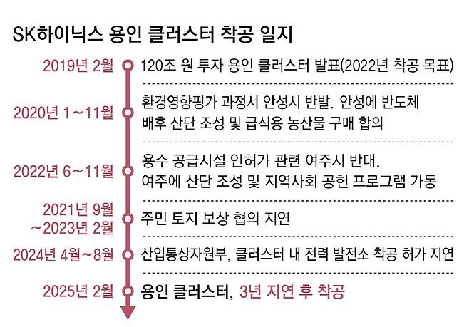 SK하이닉스가 2019년 2월 용인 클러스터 계획을 발표할 당시 착공 목표는 2022년이었다. 하지만 인근 지자체 반발에 인허가가 미뤄지고, 토지 보상 과정도 진통을 빚었다. 막판에는 전력 공급 문제까지 불거지며 착공이 3년 미뤄졌다.
