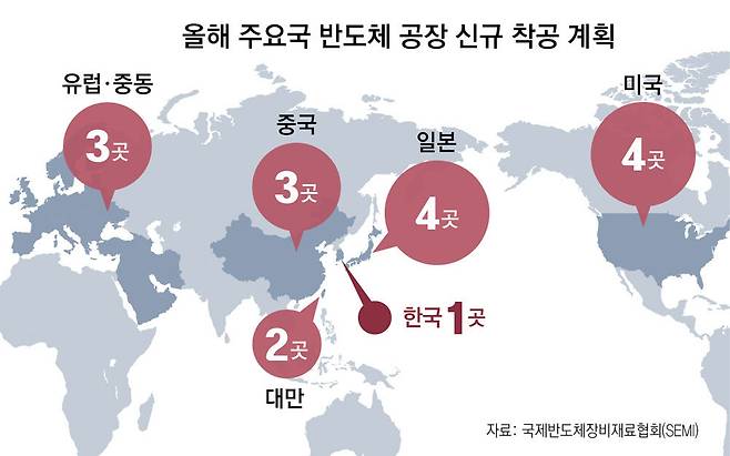SK하이닉스의 용인 팹은 올해 한국에서 신규 착공하는 유일한 반도체 공장이다. 국제반도체장비재료협회(SEMI)에 따르면 올해 전 세계에서 18곳의 반도체 공장 건설이 시작되는데 미국 4곳, 일본 4곳, 중국 3곳, 대만 2곳 등이다.