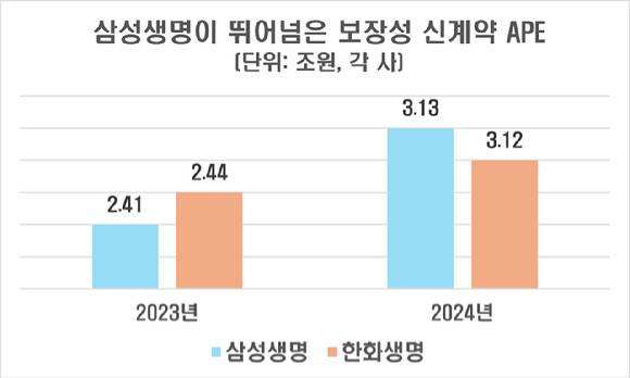 26일 삼성생명과 한화생명의 기업설명회(IR) 자료에 따르면, 지난해 삼성생명의 누적 보장성 신계약 연납화 보험료(APE)는 3조1320억원이다. 전년(2조4097억원) 대비 약 30% 늘었다. 신계약 APE는 신규 보험 계약의 보험료(월납·분기납·일시납 등)를 1년 단위로 보험사의 영업 성장력을 평가하는 지표다.