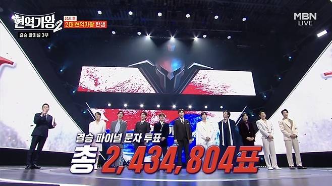 25일 200분 특별 편성으로 방송된 MBN ‘현역가왕2’ 최종회는 최고 시청률 15.1%, 전국 시청률 13.9%(닐슨 코리아 기준)를 차지하며 자체 최고 시청률을 깨부수는 경이로운 기록을 세웠다. 12주 연속 동시간대 전 채널 1위, 화요일 전 채널 예능 1위라는 확신의 쾌거를 달성하며 화끈한 유종의 미를 거뒀다.
