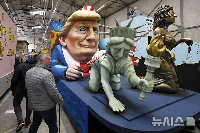 [쾰른=AP/뉴시스] 25일(현지 시간) 독일 쾰른에서 열리는 로즈 먼데이 퍼레이드를 앞두고 도널드 트럼프 미국 대통령이 자유의 여신상과 정의의 여신상을 개 목줄에 묶은 모습의 퍼레이드 조형물이 공개되고 있다. 2025.02.26.