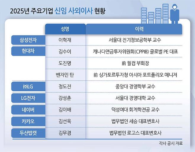 26일 금융감독원 전자공시시스템(DART)에 따르면 주요 30개 기업 중 8곳이 올해 신규 사외이사를 내정했다. 기업별로 보면 ▷삼성전자(1명) ▷현대자동차(3명) ▷LG(1명) ▷LG전자(1명) ▷신세계(1명) ▷두산밥캣(1명) ▷카카오(1명) ▷네이버(1명)로 총 10명이다.