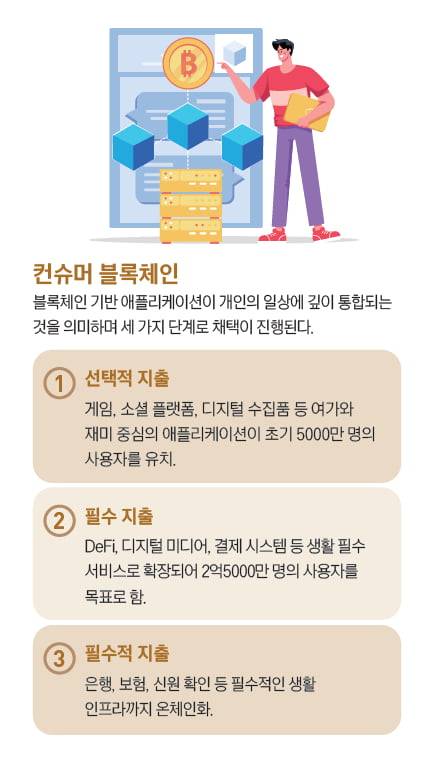 컨슈머 블록체인은 블록체인 기반 애플리케이션이 개인의 일상에 깊이 통합되는 것을 의미하며 세 가지 단계로 채택이 진행된다.