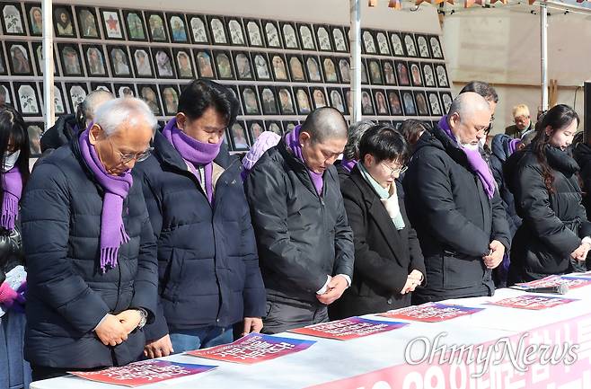 | ▲ 이태원 참사 유가족들과 민변 변호사 등이 2024년 1월 30일 오후 서울광장 분향소 앞에서 '10.29 이태원 참사 특별법 국무회의 심의 결과에 대한 기자간담회'를 하기에 앞서 묵념을 하고 있다. |