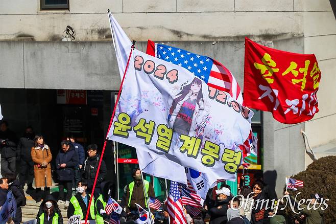 | ▲ 지난 17일 서울대 학생회관 앞에서 열린 윤석열 탄핵 반대 집회에서 한 참가자가 '윤석열 계몽령'이라 적힌 깃발을 들고 있다. |