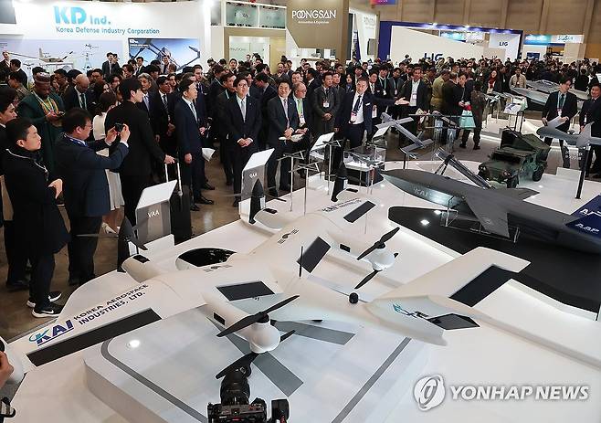 (부산=연합뉴스) 강선배 기자 = 26일 부산 해운대구 벡스코 제1전시장에서 열린 'DSK 2025(드론쇼코리아)'에서 참석 내빈들이 한국항공우주산업(KAI) 부스에서 다양한 무인기를 살펴보고 있다.