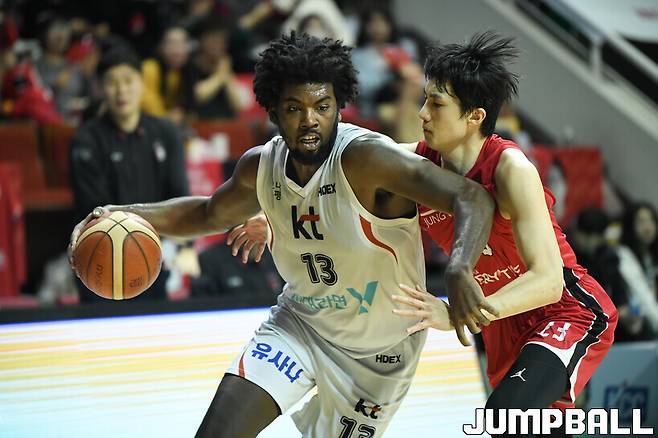 휴식기가 너무 길었던 탓일까, 양 팀은 시작부터 졸전을 거듭했다. 공격은 원활하지 않았고, 턴오버가 속출했다. 특히 슛이 말을 듣지 않았다. KT는 전반 야투 성공률 21%(8/38)에 그쳤다. 3점슛을 16개 시도해 2개밖에 성공하지 못했다.